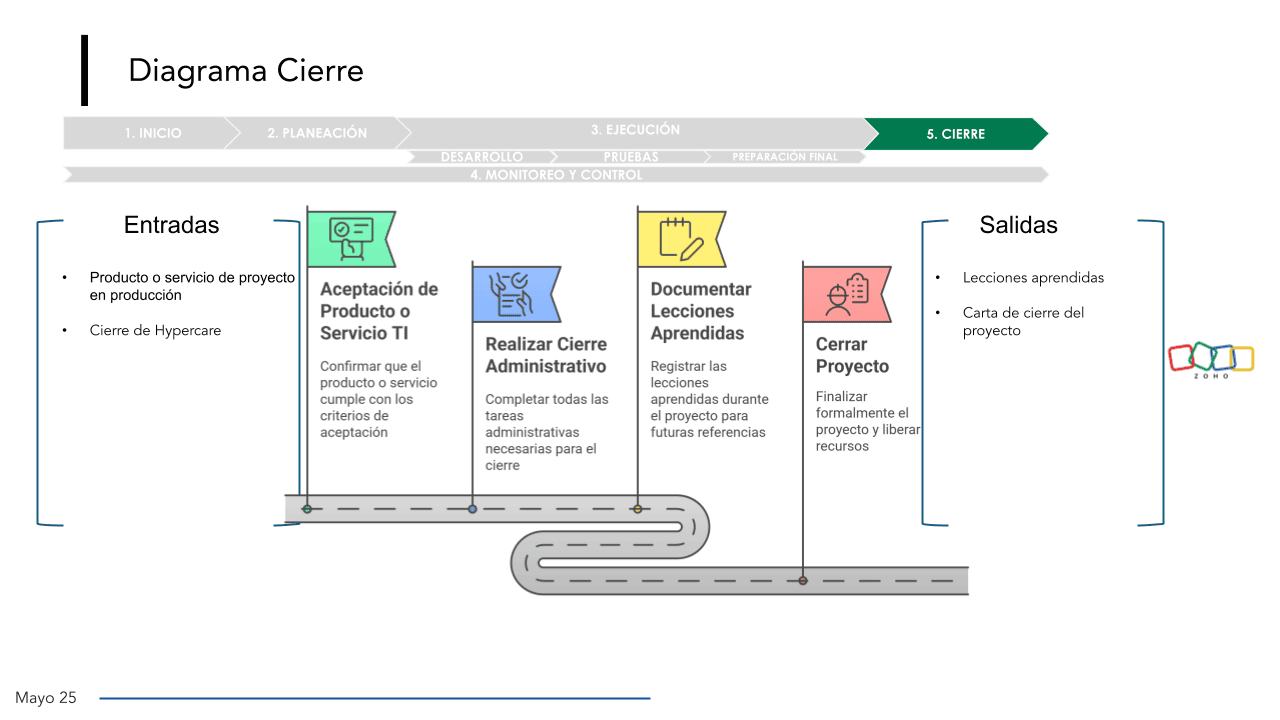 Se realiza un traspaso ordenado de la solución o servicio a la operación continua, documentación de soporte. Además, se llevan a cabo las lecciones aprendidas, recopilando experiencias que servirán como insumo para mejorar proyectos futuros.