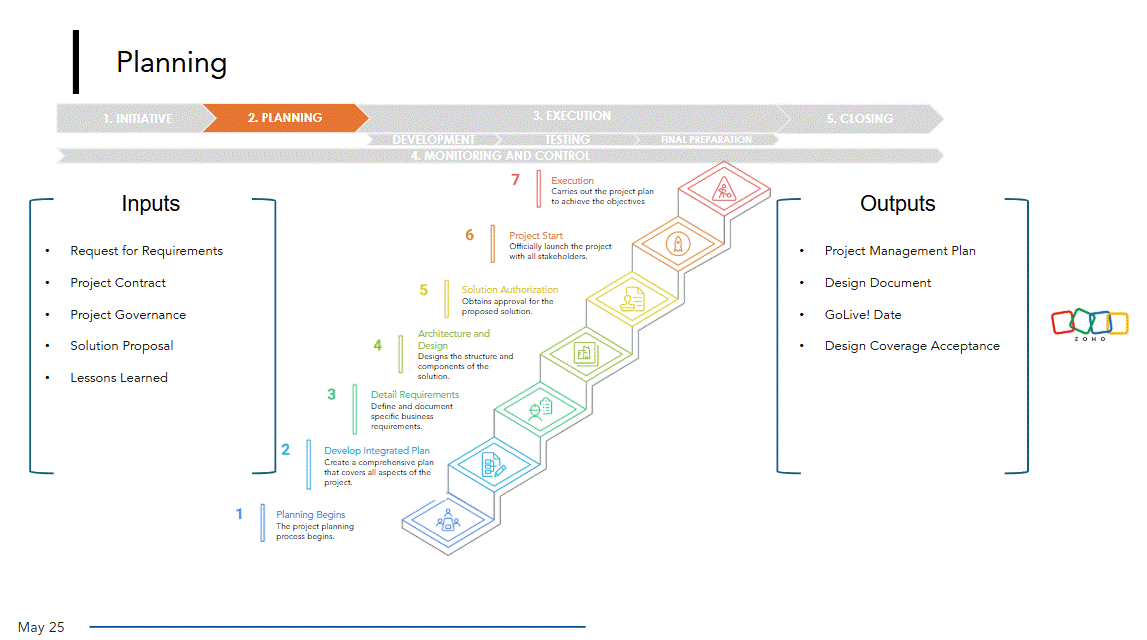 Success criteria, measurement metrics, and checkpoints are established to assess the progress and quality of deliverables. The integration of technical and business areas is also coordinated, ensuring that all stakeholders understand their roles and key milestones.