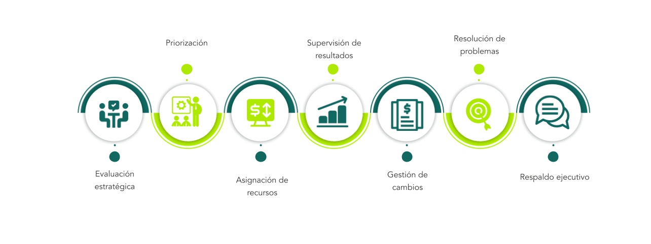 Gobierno y supervisión estratégica: Proporciona la dirección estratégica necesaria para que todos los proyectos contribuyan efectivamente a los objetivos de la organización.