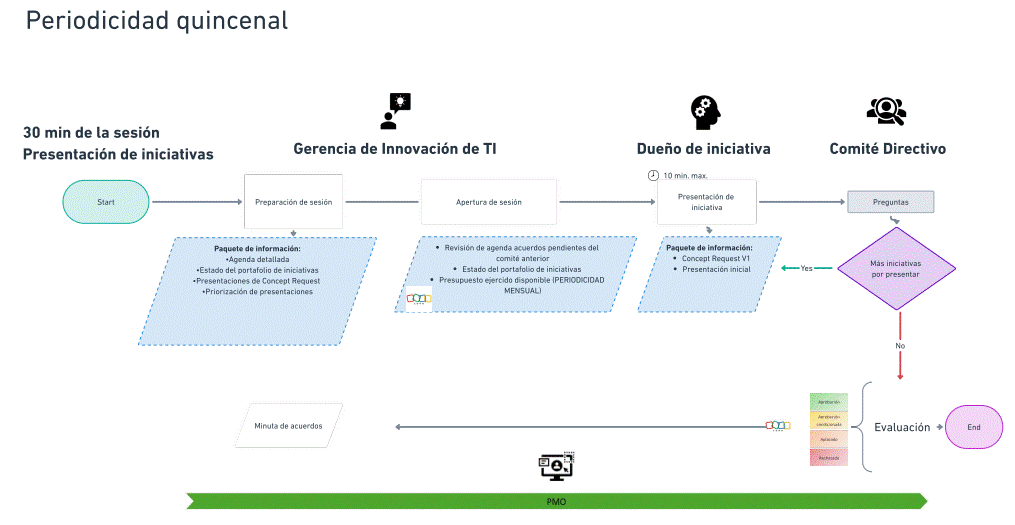 Toda iniciativa deberá presentarse formalmente mediante el formato Concept Request, acompañado de la justificación de negocio y análisis preliminar de beneficios, riesgos y costos.